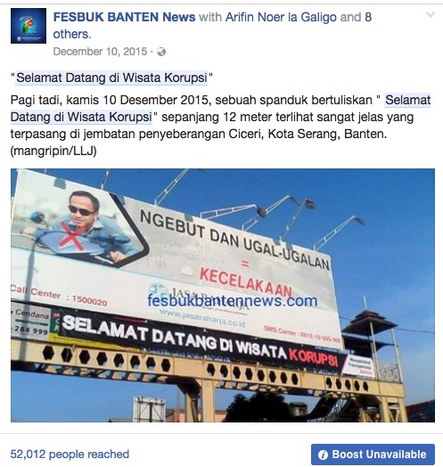 The banner with the satirical words ‘Welcome to Corruption Tourism’ appeared on a footbridge at the entrance to Serang, the capital of Banten Province. It was visible to anyone entering the city and read by 52,012 people belonging to the citizen journalism Facebook page Fesbuk Banten News (FBN). The banner played on a theme familiar to many since Governor Ratu Atut Chosiyah was indicted for corruption in December 2013; a theme where Banten is a byword for corruption. Ratu Atut was sentenced to four years’ jail for bribing the Chief Justice of the Constitutional Court, who in exchange was supposed to favour her supported candidate in a disputed district head election in Lebak. She belongs to a dynasty that has dominated the province’s political life since it was established as separate from West Java in 2000. A string of corruption allegations against the family has seen many of them land in jail.
