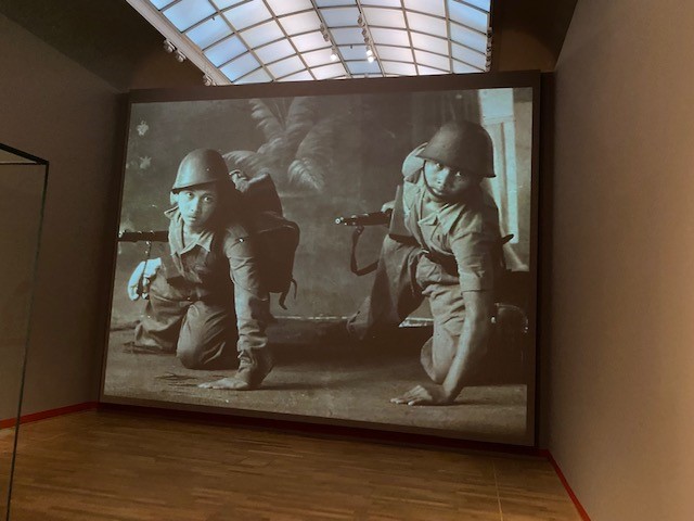 From an Indonesian perspective one of the most romanticised and mythologised figures of the Indonesian revolution is that of the pejuang, the revolutionary fighter who is generally coded male and as fierce in spirit. An opening display entitled ‘Faces of the Revolution’ draws visitors into the mythologised world of the pejuang through the creative use of the pocket photo book of S. Narudin, which was confiscated by Dutch intelligence forces upon his arrest. In one of the first rooms in the exhibition, studio-style photographs of Narudin and his comrades from the photo book were blown up and projected on a wall producing a particular aesthetic of the revolution.