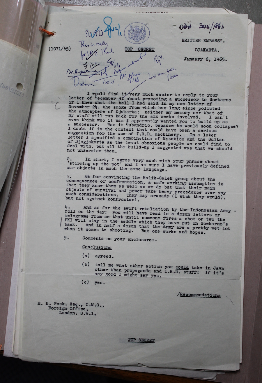 How British officials wished for the propaganda to work is clear from correspondence in the diplomatic files. They hoped it would provoke the PKI into a rash power grab, which would then justify a violent response by the army. In late December 1964 under-secretary to the foreign office, Edward Peck, wrote to the British ambassador to Indonesia, Andrew Gilchrist, that it was important to ‘do anything we can to help to create conditions likely to induce the PKI to show their hand prematurely and invite swift retaliation from the Indonesian Army’. In a letter to Gilchrist dated 25 January 1965, head of the Indonesia/Malaysia department at the foreign office, Anthony Golds, assured the ambassador that they will ‘certainly do what we can… to spark off a shooting war’. It was now just up to IRD’s output to bring all this about.